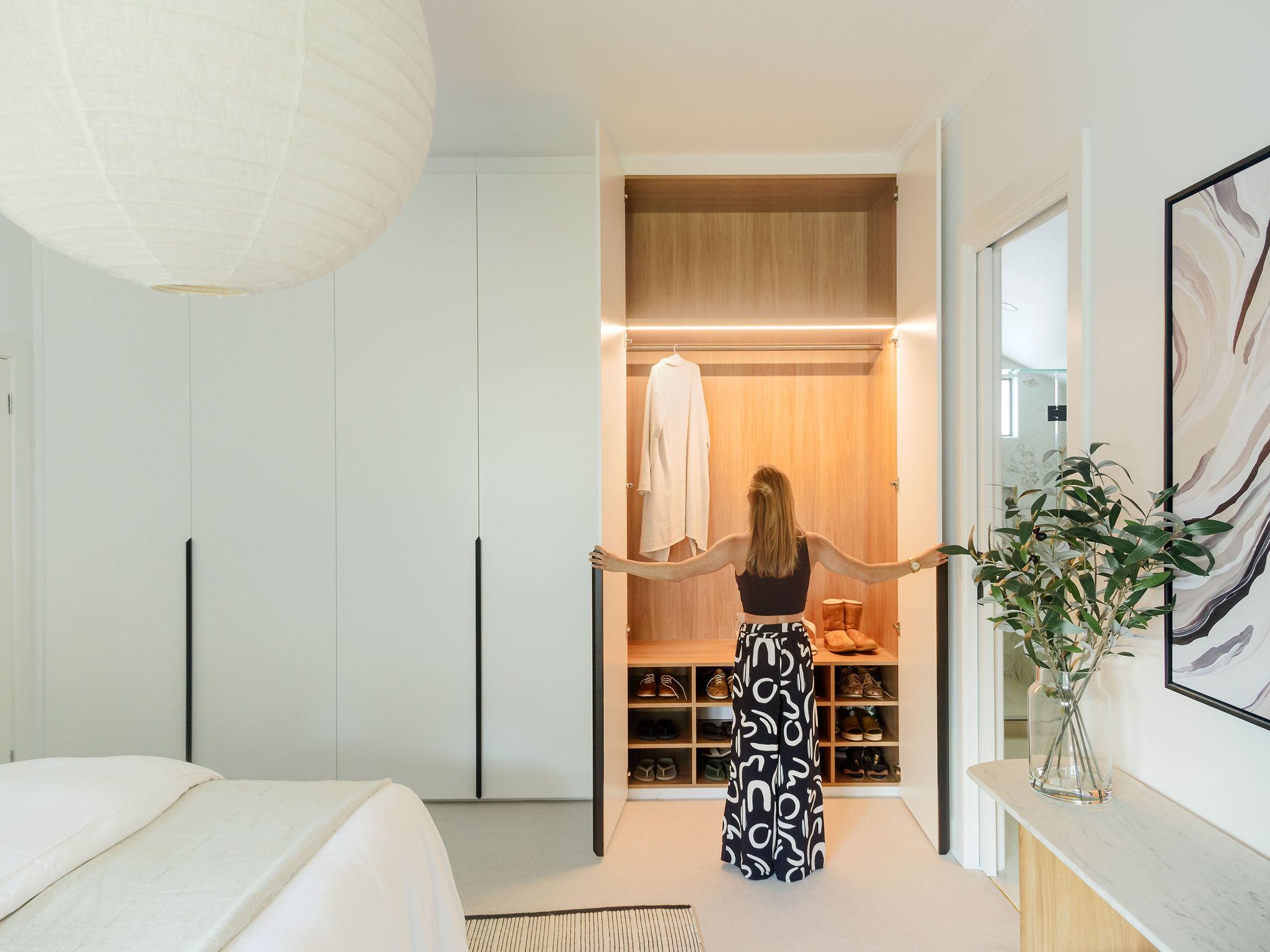 The master bedroom saw significant structural transformations. With the original fireplace unused, its removal freed up valuable space within the room. This allowed for the expansion of the ensuite, accommodating a double vanity and a walk-in shower complete with a seat. We moved the bedroom entrance slightly to enable a wall-to-wall, floor-to-ceiling built-in robe. The meticulously designed joinery, featuring sensor lighting, not only boosts functionality but also adds grandeur to the room with its impressive height. We removed the picture rails (as they were complicating the heights of joinery) and ceiling strapping from both the bedroom and office, making way for the installation of new ceiling roses to accommodate modern lighting fixtures.